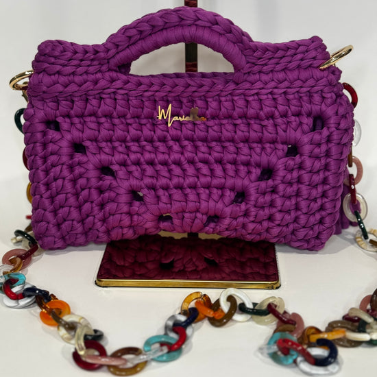 Granny bag made with T-shirt yarn in color Fuchsia. Crossbody handle.