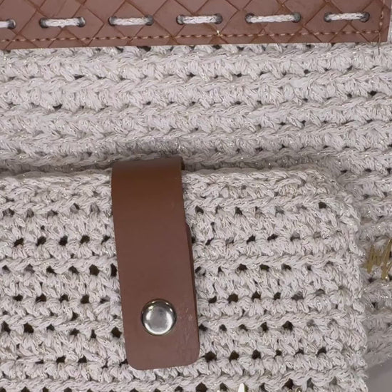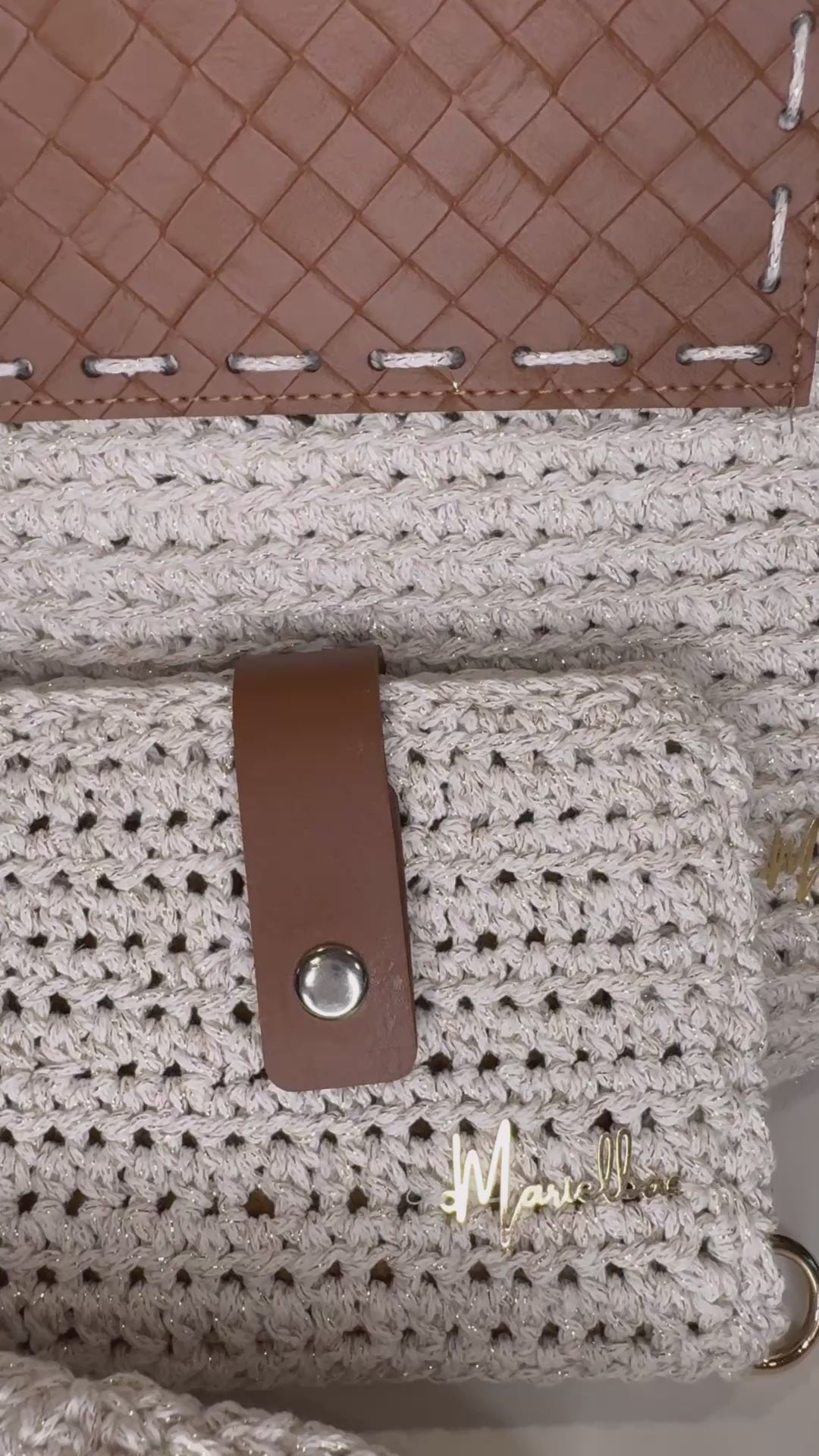 Crochet bag with wallet and glasses case. Macrame beige cord with gold